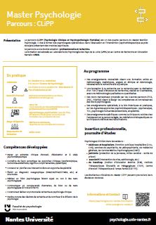Le Master de Psychologie, parcours CliPP (Psychologie clinique et psychopathologie plurielle) forme des psychologues spécialisés dans l’évaluation et l’intervention psychothérapeutique auprès de sujets présentant des troubles psychiques. Le parcours CliPP délivre le titre de psychologue, et ouvre également à la poursuite d'études en doctorat en psychologie. Il ouvre également la possibilité d’obtenir le titre de psychothérapeute.